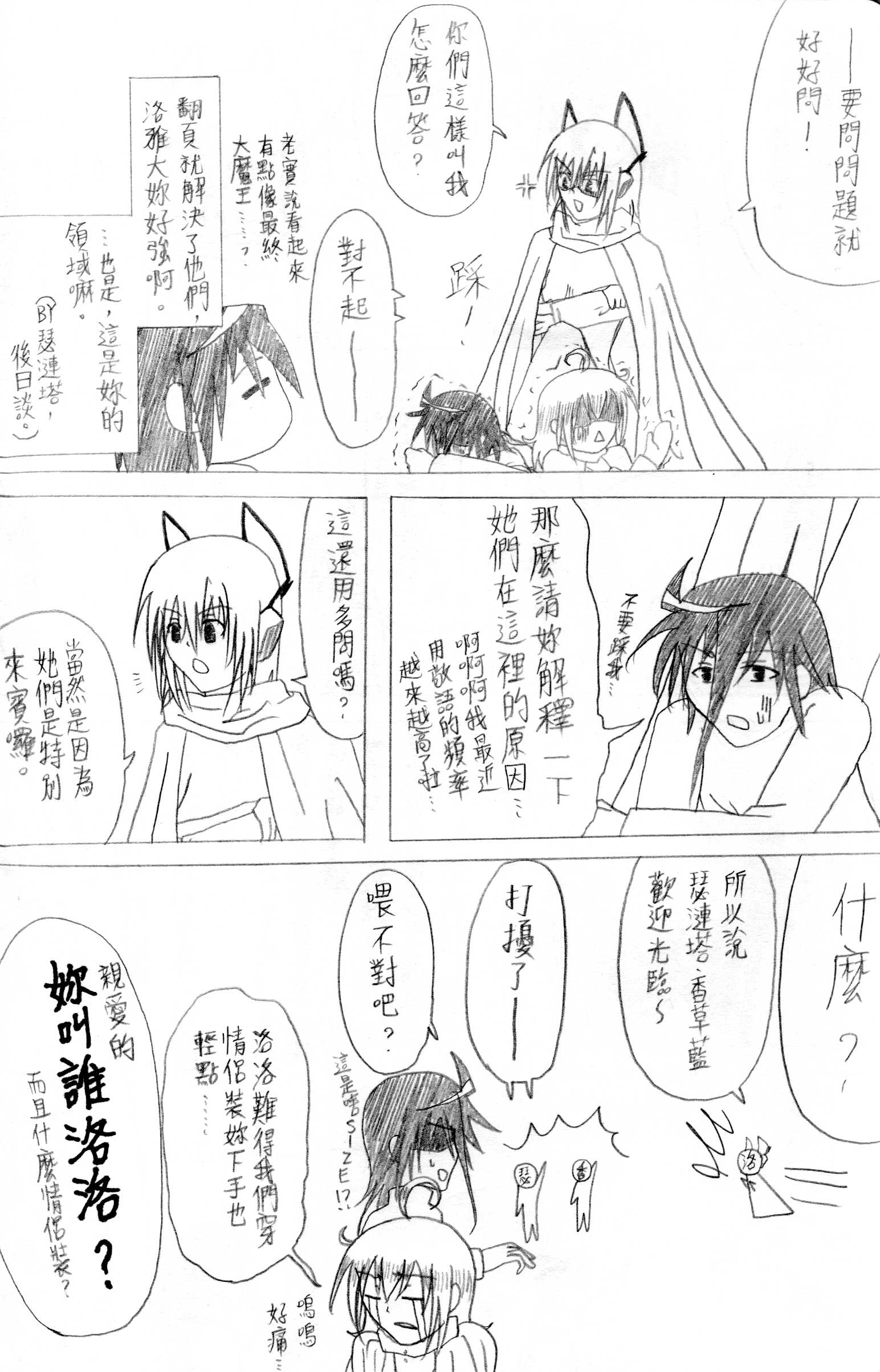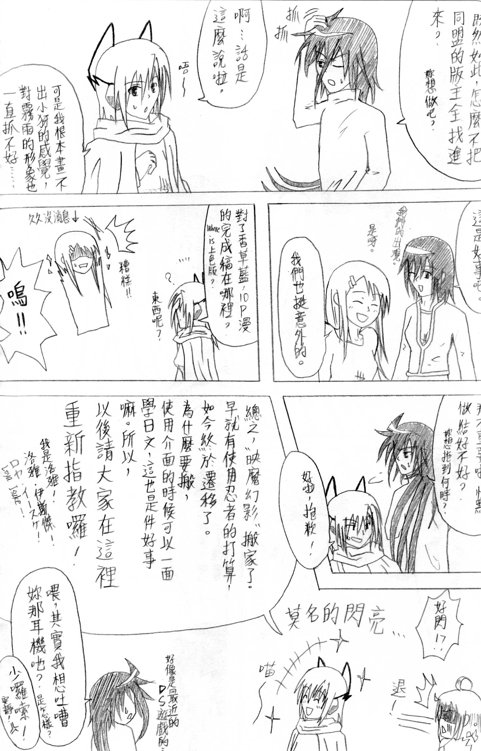 有我欸!!!!(指) 媽,我上電視了!!!!!(激動) (A:不太對吧?) 沒想到會看到自己出現在短漫裡 真是又驚又喜XD 另外關於10P短漫的事 我會盡量加快自己的速度的 不過也不知道到底可以快到哪去Orz 因為自己很龜毛,不畫到自己滿意決不罷休 可偏偏又是越改越糟,所以就索性全部重畫XD" (A:妳在搞什麼啊?) 不過我也必須承認自己最近有荒廢到 Orz 對不起我錯了(跪)