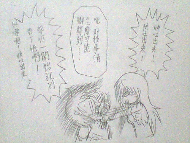說實話到目前為止這4本裡面還有一些因為當下沒有興趣所以自動過濾的內容存在(被打) 看完X卷並且在看過薔薇のマリア@wiki弄懂一些原本沒搞懂的地方後,然後畫了這個東西(笑) 內容有捏到X卷,所以慎入喔XD 老實說我真的挺想這麼做的……(笑) 嘛、就是這樣啦(攤手) 這是手機拍下來的,畫質沒那麼好請見諒w eri家裡掃瞄器快要壽終正寢了囧 X卷最後,亞濟安對盧威.布盧姆說:「adieu, dad.(永別了,父親。)」 附帶一提:日文字寫著「さよなら、父さん。」(原文庫是寫日文然後旁邊附註他說法文字這樣) 然後,就用ヤヌゥ把盧威.布盧姆給吞掉了。 吞掉了啊啊!亞濟安你竟然把那種傢伙給吞掉了啊啊啊!(震撼) 就算ヤヌゥ是黑洞也請別這樣做啦啦啦啦啦!(激動) 所以…… 洛雅「快吐出來啊啊!」 亞濟安「快、快住手啊、頭好暈。」 其實我整個是有畫成一頁漫畫的,還被eri說分鏡很好(心) 雖然很想放上來~(看旁邊) 不過第一,剛剛說過,eri家掃描器問題,而且我家掃描器不能用(笑) 然後第二,那全部建立在夢文架構上,所以還是不要輕易丟上來的好。 老實說我已經想好兩部了、關於8卷起是第三部(毆) 已經自我擔心胎死腹中可能性XD 不過如果要關於這邊的配對的話放心亞濟瑪利成分是一定有的(遭踹) 只是我跟藏帶頭混進去了而已(喂) 萊特「如果是以正常方式吞食的話…… 肯定會腹瀉的吧?」 七誌「上吐下瀉。」 狩行「不論如何都對身體不好。」 眾os(不過洛雅,又不是妳吞……) PR